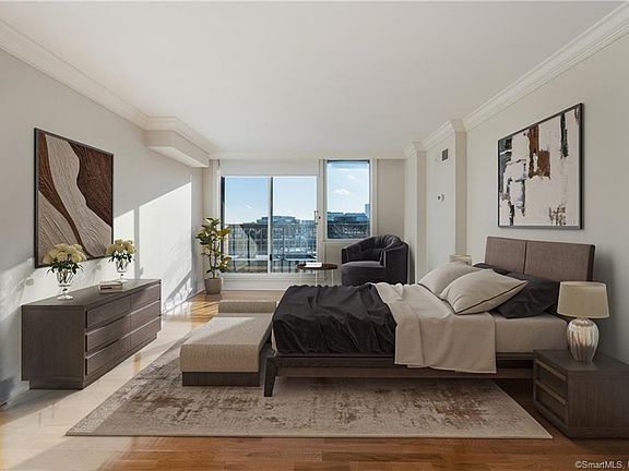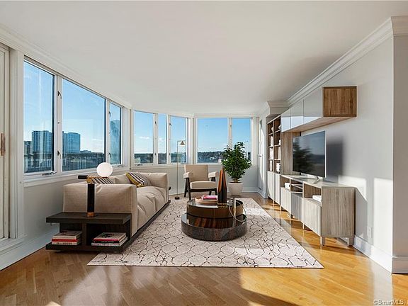 Sun Drenched Pristine Luxury Penthouse! This is a unique space w/expansive skyline city views & amazing natural light! The sunsets are breathtaking & can be enjoyed from any of the large private balconies. This premier luxury complex is located in the heart of Stamford, is pet-friendly w/ its own private dog park & offers so many amenities from 24/7 concierge, shuttle to train & recreation areas incl. glass-enclosed rooftop pool, fitness center, picnic/bbq area & club room. Once you step foot into your new home, you are drawn to the amazing space, lined w/windows featuring panoramic views that make you feel like you're on top of the world. The open concept space includes a designer kitchen featuring Carrera marble counters, professional Viking & Sub-Zero appliances & bar seating. Fees include: Gas, Water, Sewer, 1-parking spaces in gated garage & building amenities. Incredible downtown location is walking distance to shops/restaurants, theater, parks & the beach.