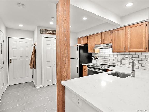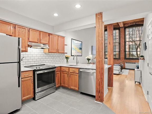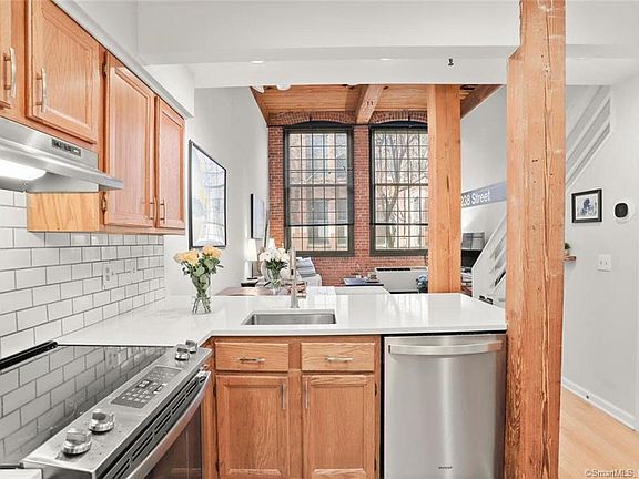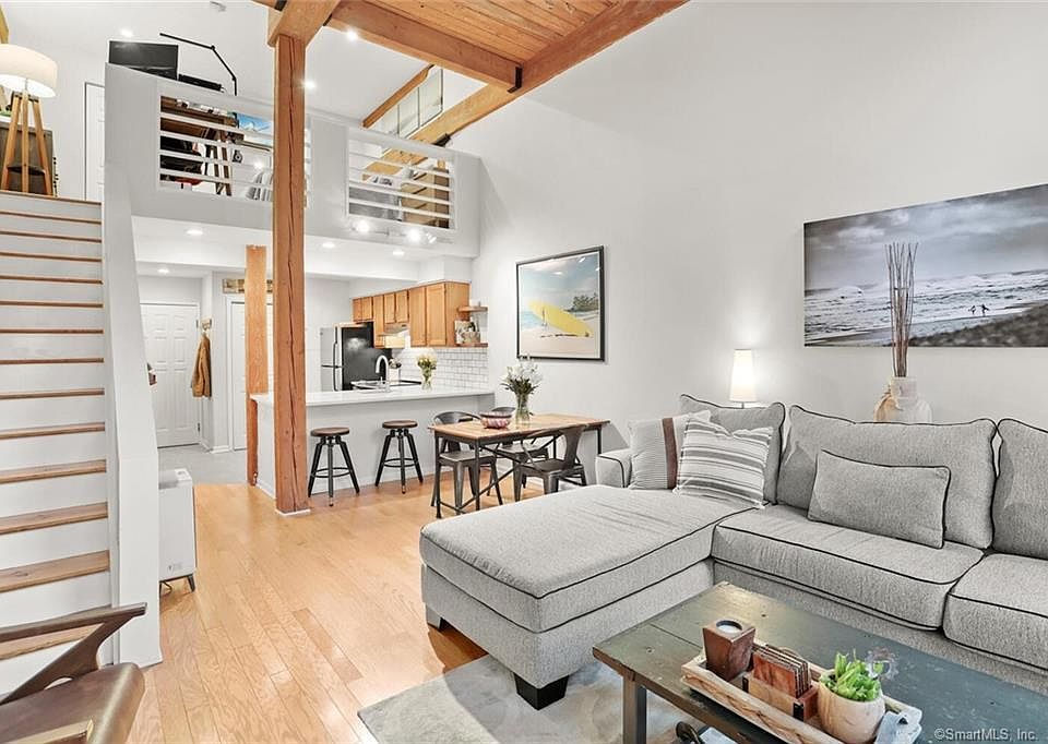 Beautiful NYC-style loft condo in the sought-after, renovated hat factory known as Clocktower Close. This stunning, freshly-painted loft features 14' ceilings, two-story windows, exposed original wood beams, and a stunning brick wall that adds warmth and charm. The open kitchen/dining area has been renovated with quartz countertops, a subway tile backsplash, large gray tile floor, a stove/air fryer, and a dishwasher. The new chic, modern half-bath just off the kitchen provides style and convenience on the main level. The upstairs primary bedroom suite is spacious and private and has plenty of closet space and newly installed recessed lighting. Many amenities, including a fitness center with sauna and locker rooms, conference room, community game room/lounge and community kitchen, laundry room and landscaped courtyard. Located just 7-minutes from bustling downtown South Norwalk, restaurants, shops, Norwalk beaches, train, I-95 and the Merritt Parkway.