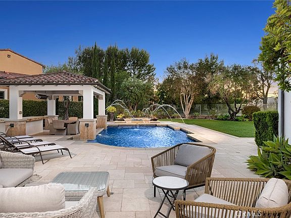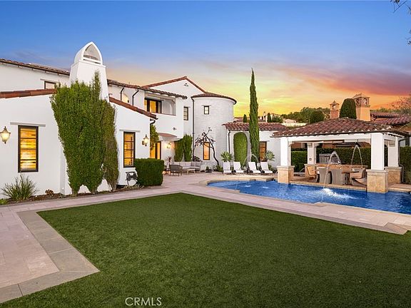 This beautiful home in the guard-gated community of The Summit at Turtle Ridge feels like a Mediterranean escape. A grand entry rotunda welcomes guests and plentiful French doors grace views to the stunning rear grounds. With drought-tolerant landscaping such as succulents, manzanita, and turf, spend the day lounging on the sun-soaked patio while taking in the panoramic canyon and city views beyond the turquoise salt-water pool and spa with cascading fountains. Entertain guests at the outdoor kitchen and covered dining area, then gather around the fire pit to watch the sun set. Additional patio space outside the downstairs guest bedroom is ample enough for basketball, and the turf lawn allows for some casual putting practice. Inside, the approximately 5,700 square feet of living space offers en-suite bathrooms to all five bedrooms, an office, living room, great room and bonus room. The chef’s kitchen includes a 8-burner Wolf range, premium stainless-steel appliances, a large center island with countertop seating for four, a nook, a large walk-in pantry and a butler’s pantry. The kitchen opens to a family room for easy entertaining, while a formal dining room lies in an adjacent room, opposite the opulent glass-walled wine cellar. Upstairs, a bonus entertainment room provides private family relaxation beyond the primary and three secondary bedrooms. A fireplace in the primary suite creates a cozy ambiance, while the very large bathroom epitomizes luxury, with a soaking tub separate from the shower, extra vanity space, a privacy toilet closet, and dual walk-in closets. Several balconies, including one in the primary suite, overlook the peaceful neighborhood, which lies on a highly desirable cul-de-sac. As part of the Summit at Turtle Ridge, residents enjoy resort-style amenities, including two pools, a clubhouse, fitness center, and a playground, as well as convenient access to hiking trails. Residents are also privileged to live near award-winning schools such as Vista Verde Elementary and Middle School, TVT, and University High School.