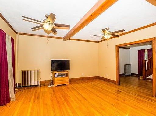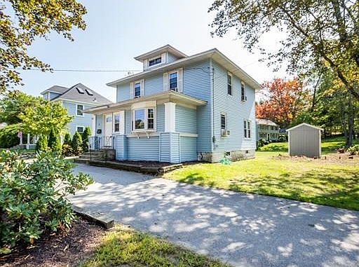 Entering into an enclosed front porch with possibilities for office/playroom you then enter the foyer of the house, Beamed ceilings, hardwood floors and a large living room, dining room, kitchen and half bath complete the first floor. Four good sized bedrooms and an updated bath make up the second floor level. Updates include a new gas boiler in 2010, roof in 2009 and windows in 2005. The house sits at the front of a quarter acre of land leaving plenty of back and side yard for your leisure. Great location with close proximity to downtown Maynard, highway access and commuter rail.