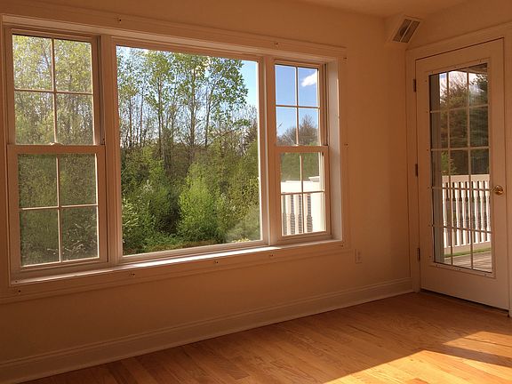 Private end unit on first floor. Quiet location, 55 and over community. Spacious living/dining room with wood floor, ample closet and cabinet space. All modern appliances. Ceiling fans in living room and master bedroom. Custom-made interior storm door and windows for added insulation available. Common areas include library and community room. Welcoming and friendly neighbors, many community activities. Garden plot available. Great view of sunset from large picture window and covered balcony, views of woods from all windows. Ideal location, close to shopping outlets and downtown. Easy walking distance to large nature area (Bramble Hills Farm) and bike trail.