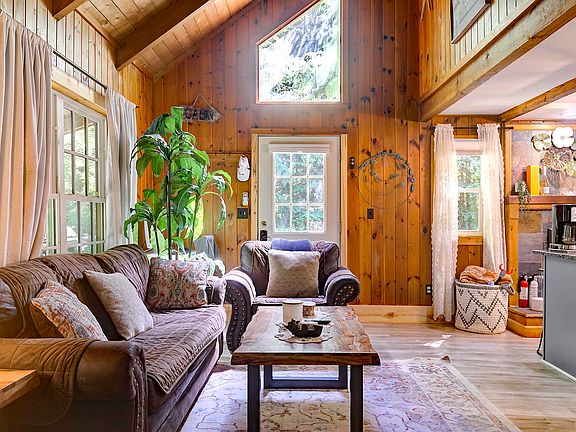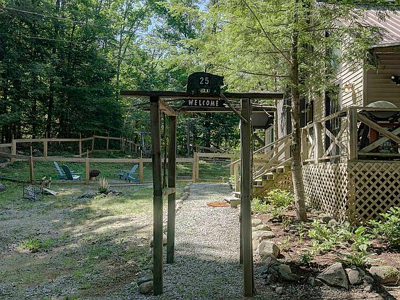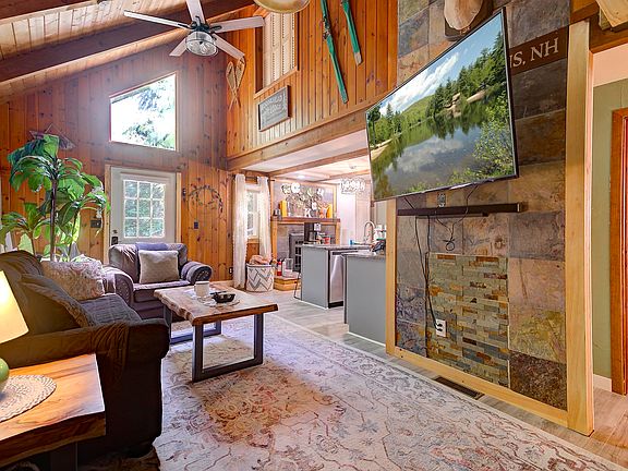 A charming country home with a farmer's porch and natural pine paneling throughout give this home the ideal mountain cabin feel! There have been a number of updates including new flooring, new kitchen with large center island, new trendy front door, new showers in both bathrooms, wireless keypad entry, wireless thermostat, new insulation underneath, new on demand water heater and the installation of central air conditioning! The living room is open to the kitchen, with cathedral ceilings and large windows. On the main level is also a bedroom and a full bath, and upstairs is two more bedrooms and another full bath, and a small loft space. There is a pretty sunroom located off the kitchen that looks into the backyard and is sure to be your favorite coffee spot. The yard has been fenced in to protect kids and pets alike. The back of the lot has frontage on Eben Farm Road which gives you plenty of space to store toys and trailers. Conveniently located at the bottom of Eidelweiss Village - you’re just minutes away from all Mount Washington Valley has to offer, with access to the Pea Porridge Ponds and Silver Lake.