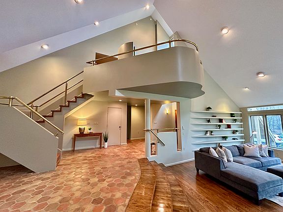 This one-of-a-kind Frank Lloyd Wright inspired masterpiece was designed by Key West architect Michael Ingram who brought natural elements, colors, textures into his work while creating stunning open spaces defined by organic shapes, changes in floor elevations, soaring ceilings and walls of windows worthy of a cathedral! Step inside the large double doors and drink in the gallery-like open-concept living space including a large sunken living room filled with natural light and centered on a massive floor to ceiling wood fireplace connected to a unique custom kitchen with high end appliances, curved work station islands and a sunny breakfast nook. A stunning 2 sided cherry buffet defines a large dining room with glass doors to the granite patio along with a bright screened porch connected to a front deck. 2 sizeable bedrooms (one with a ensuite bath), an office/4th bedroom with custom built-ins, 3/4 bathroom and mudroom complete this level. Climb the suspended curved staircase to the sprawling primary suite with vaulted ceilings and a roof deck overlooking the grounds, along with a room-sized walk-in closet and spa-like master bath with 2 sinks, jetted tub, tiled shower and nearby laundry room. Outside, enjoy complete privacy surrounded by 12+ acres of woods and exquisite landscaping located in beloved Jasper Valley, with its popular swim/tennis club. Set in desirable Amherst with top-rated schools, town trails and easy access to highways and shops. Don't miss this rare find!