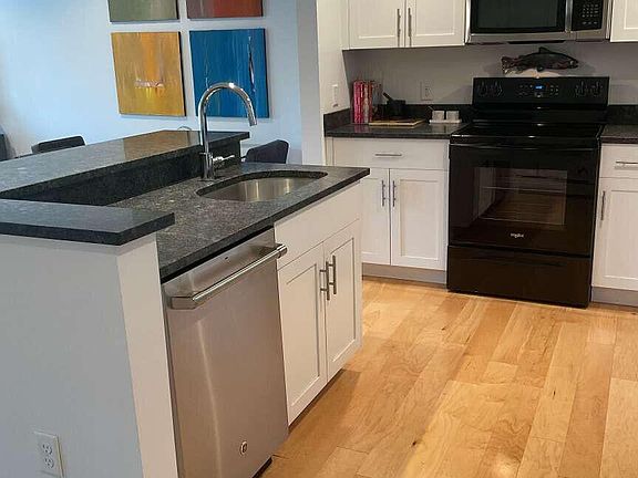 Nestled between the Old Port, Arts District and the West End, this modern 1 bedroom, 1 bathroom condo is a walkers' dream with restaurants, shops, galleries, waterfront and breweries all within several blocks. The kitchen has excellent storage, sleek modern cabinetry and quartz countertops with a generous sized island which can easily seat three. The main living area boasts shiny hardwood floors and large windows that bring in a ton of light with room for a dining table by the kitchen area allowing for comfortable and cozy living. The spacious bathroom includes a stackable washer/dryer alongside a spa shower enclosed by a glass door. The bedroom closet has a California Closet system for ample storage and organization options. The building offers many amenities including secure lobby doors, keyless entry system, passenger elevator, well equipped fitness center with aerobic machines and free weights, separate bike and kayak storage, common outdoor patio, as well as a storage unit on the lower level. Guaranteed leased garage or surface parking options are available. Indulge in a lifestyle of luxury, convenience and tranquility with this exquisite condo!