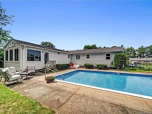 East side of Meriden offers a 3 Bedroom, 1 1/2 bath, RANCH STYLE home with A/C, a beautiful built-in pool and patio surround. This home is perched on a level lot and in a delightful neighborhood. The living room has a wood burning fireplace with mantel, dining room has custom built-ins, family room or home office has a separate entry and leads to a lovely vaulted and heated sunroom overlooking the backyard. Hardwood floors UNDER THE CARPET in most rooms and thermopane windows. Presently, the smallest bedroom is being used as the laundry room and it has built in cabinets. Relocate laundry to the basement if you need the third bedroom; hook-ups remain. Eat-in full spacious kitchen, with newer appliances. Kitchen window overlooks the backyard and pool. The full bath offers a walk-in shower. The full basement is dry and perfect for storage, a workshop, and with imagination you could have a WONDERFUL MAN CAVE or work out space. If you are looking for a sound investment, have fun personalizing this home, the possibilities are endless. Newer boiler, and new pool filter. Note: Most of the garage was converted into a dining room. The garage door is operational and the remaining space is suitable for large lawn equipment, however, does NOT accomodate a car. The yard is mostly level, with a gentle taper, mature plantings and private. Shopping, commuter dream. Discover this gem today Just unpack your bags and jump in the pool.