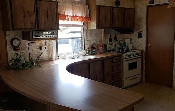 NO PROPERTY TAXES! This 2 bed, 2 full bath home offers a large living room with exposed beams with lighting, built ins and carpet with plenty of windows for natural light. On one side is the master bedroom with a wall of closets, 2 double hung windows, and master bath with soaking tub, single sink and vanity and triple mirrored medicine cabinet. Through the living room is a very large eat in kitchen with plenty of cabinets and pantry. The range, dishwasher and refrigerator are included in the sale. The large counter space offers an eating area and includes the 4 stools. Through the kitchen is a laundry room with included washer and dryer, storage cabinets and door to side yard. The 2nd bedroom faces the front of the home and has another large closet, included computer desk and access to the hall bath. The roof has been replaced. There is a sound system with speakers in the ceilings. Outside is a covered porch which spans over half the length of the home. A storage shed is included for your extra storage needs. This home is in good condition and has been well taken care of for over 25 years by it's current owner. Updating is needed, but what a good price for everything this home has to offer. All applicants must be approved by Mobile Estates.