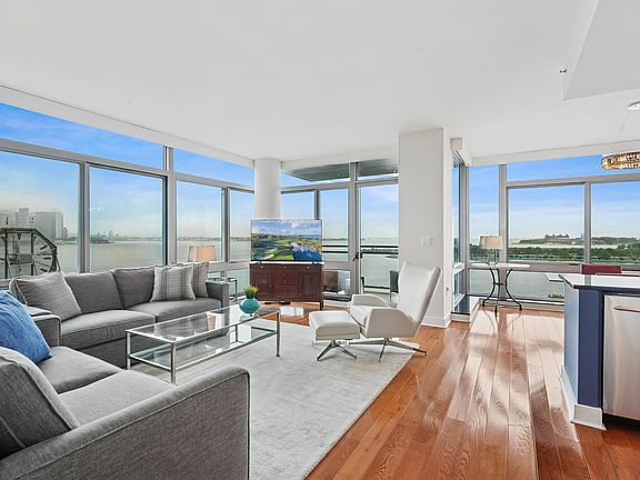 PAULUS HOOK direct high-floor SOUTHEAST corner wrapped in all glass! This impeccable 2 bed, 2.5 bath plus PRIVATE TERRACE faces NYC, Hudson River, Statue of Liberty, Verrazzano Bridge, Ellis Island, and the outer Boroughs through walls of floor to ceiling glass enveloping the entire home! These unobstructed and completely private views are found in every room of the home, and are all yours! Inside Residence 803, over 1,450 square feet of the finest fit and finishes await. Spectacular open floor plan with split en-suite bedrooms for complete solitude, as well as separate power room for the high profile guest. The world is your moving artwork, as your fully encompassed by spellbinding views, ever changing land and sky-scapes, magical sunrises, glorious sunsets, harbor ships, and so much more. Gleaming hardwood floors, custom remote controlled window treatments, brilliant paint hues, and full sized w/d are just the beginning. Chef's kitchen in azure blue cabinetry with contrasting uppers, stone countertops, and breakfast bar overlook the full dining area, open living/entertaining space, and private terrace. King-sized primary bedroom sanctuary with closets galore, and a spa bathroom with separate soaking tub and frameless glass shower. The second bedroom prominently frames the Freedom Tower front and center and also has it's own luxurious bath. This home is being offered fully furnished as shown with one garage parking space included. Meant for the movie-star, professional athlete, corporate raider, or anyone who wants to live the fabulous life! Full service Liberty Terrace condominium features 24/7 doorman/concierge, gym, and outside your front door awaits 2 PATH stations, NY Waterway, unbelievable dining, shopping, Whole Foods Market, PS16/Bradford School district, waterfront promenade, and easy access to Rts 1, 9, 440, 78, NJ Tpk, NWK airport, and Shore Points. This is the rarest of opportunities not to be missed!