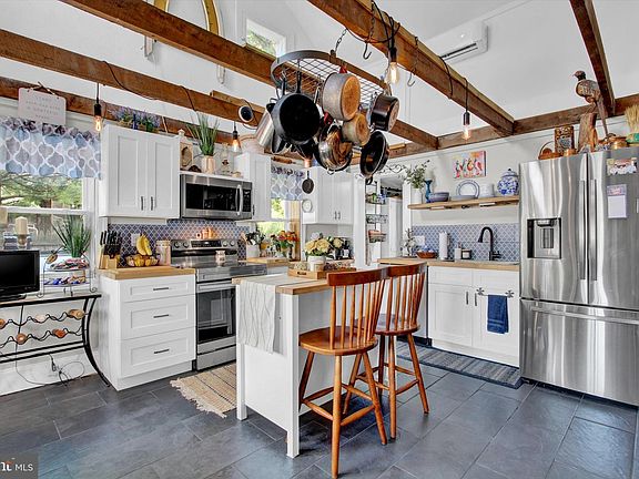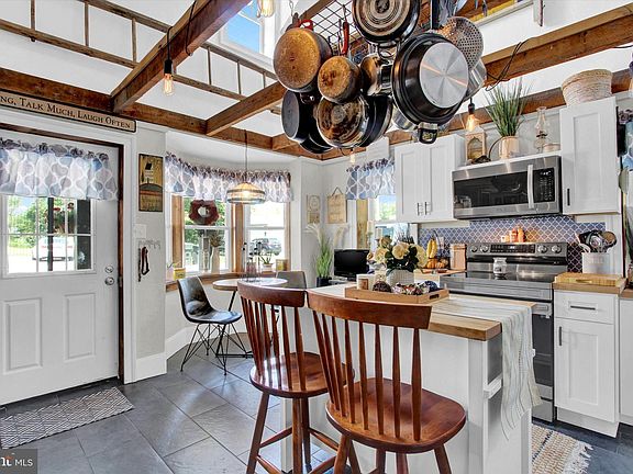 Charming & renovated 1248 sq.ft 3 bedroom 2 full bathroom 1.5 story cottage only several miles from historic downtown Gettysburg, PA suitable for single family home or investment as AIRBNB. Feel the pride of ownership in this lovingly cared for home (originally log construction) which offers hand hewn wood flooring, open beam and cathedral ceilings, 5 dual HVAC mini-split units, neutral paint/flooring throughout, stoned driveway with 3 off street parking spaces (with picnic table removed), metal roof, replacement double pane windows with wood sills, 35 X 7 front covered porch and rear metal 23 X 15 storage shed w/ electric and concrete block flooring. Design features include expansive eat-in kitchen with white cabinetry/wood countertops/tile flooring/stainless appliances/tile backsplash/2foot wide sink/ 5 x 3 bay breakfast seating area/vaulted ceiling/ceiling fan, first floor full bath with soaking tub/walk-in shower/ceramic tile flooring, first floor laundry with large garden window, exercise room with large garden window/access to crawlspace and rear foyer used for pantry/access panel to 200 amp electric panel box. Seller uses first floor bedroom as living room and second floor bedroom/loft as office/guest room. Enjoy R & R in the private rear garden oasis ...... partially fenced with flagstone/pebble patio & freshly created rock lined shade gardens. ZONING IS MIXED USE VILLAGE & HISTORIC VILLAGE OVERLAY. So much to offer, come see !