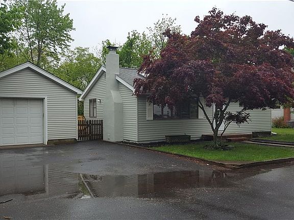 Adorable starter or retirement home on dead end street, 2 bedrooms, 1 bathroom, large living room with high ceilings, skylights and brick faced wood burning stove. Refrigerator, washer & dryer included. Detached garage has plenty of room for storage if needed. Large deck overlooking pretty backyard. Newer roof, skylights, hot water heater, and air conditioning. Cute as a button, come take a look today!