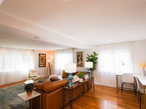 Tucked away from the street, this renovated home boasts hardwood floors throughout and central air conditioning. The oversized living room welcomes you with a comfortable leather sectional and a 55" flat-screen TV. Adjacent to the living area, you'll find a formal dining space, a large kitchen with ample cabinets, an additional wet bar, a full bathroom, and an office area.