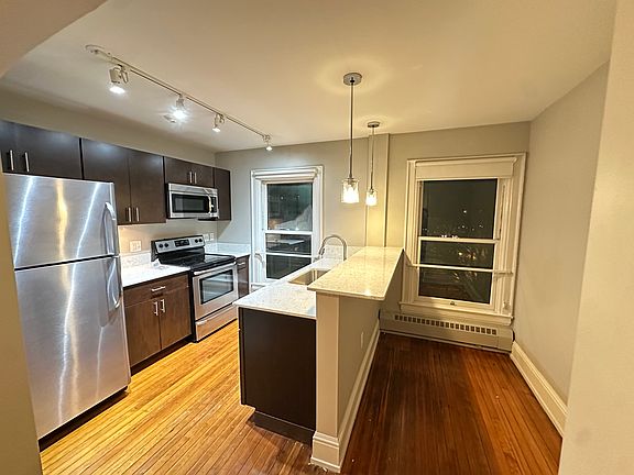 This 1-bedroom, 1-bath apartment features a spacious layout with refinished hardwood floors and a bright kitchen equipped with stainless-steel appliances, dark cabinetry, track lighting, and new marble-style countertops for a clean, updated look.