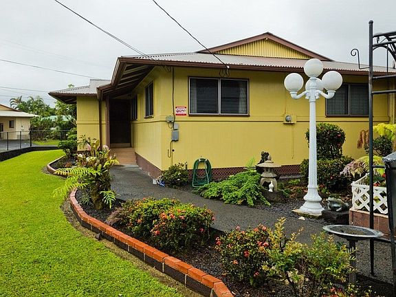 Looking for a home in Hilo only minutes from Downtown? This home is located in an established neighborhood just off Kaumana Drive. Home sits on a lovely landscaped lot that has peek a boo ocean views from the living room. Entrance into the living room has charming shoji screen doors. This spacious home boasts a large living room and family room with brick accents. Off the family room you will find a patio with a wet bar, perfect for hosting get togethers with friends and family. There is a kennel for pets with gated paddocks and large tool room. Property is fully fenced. Fencing includes a solar powered gate for your convenience. Don't miss out on this opportunity and schedule a showing today!