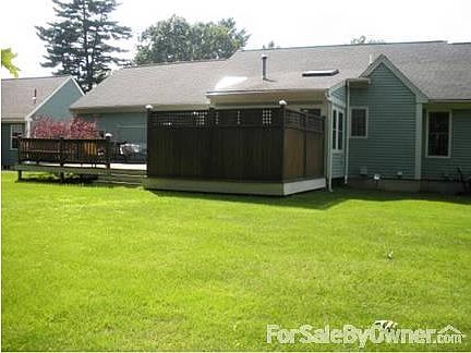Wonderful homein Stratham, NH's exclusive Turnberry.Situatedon a cul-de-sac, this home offers entertainment on the farmer's porch or backdeck plus year round fun at the pond and nature trails close by. Open concept kitchen/dining area expands to alarge living room with cathedralceilings. A cozy four season room leads to large mahogany deck area with aprivate back yard. Ceiling fans in all rooms. First Floor Master with privatebath. Forced Hot Water Oil Heat oversize 4' x 8' walk-in closet. Enjoy the privacy of having your ownoutside secluded hot tub. Irrigation system to keep your grass green! OutdoorStorage Shed for all your lawn equipment. WonderfulAssociation surrounded by Conservation Area.Locationprovides easy commute to anywhere: 10 min to Rt95 Hampton Tolls; or Free Commuter Parking (C Amtrak toNorth Station); 15 min to Downtown Portsmouth and Rye Beach; 30 min to ManchesterAirport. Listed below currenttax assessed value of $362,300 Additional property info: http://www.forsalebyowner.com/listing/3-bed-Single-Family-home-for-sale-by-owner-25-Kinloch-Dr-03885/23973345?provider_id=28079
