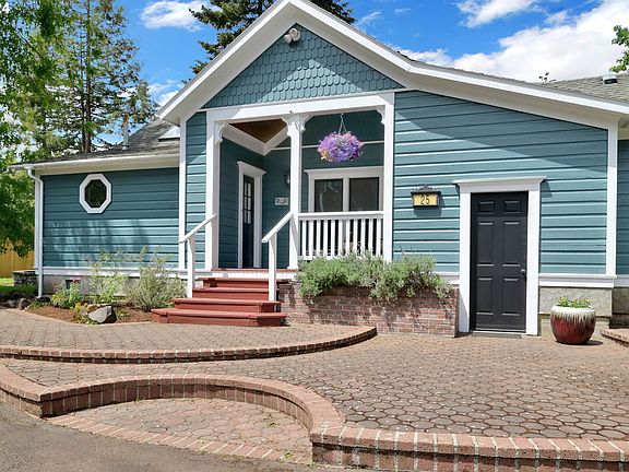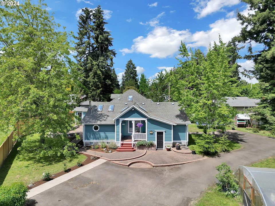 Charming & well crafted 3 bedroom 2 bath 1890 farmhouse with 9' ceilings, tall baseboard trim, chair railing, crown molding, Pella thermal wood windows, wood and tile floors, cook's kitchen, patio with pizza oven and low block stone surround, 3 covered porches, skylights, separate office/studio, .66 acre lot, large greenhouse, chicken coop and free-range area, brew room, small shop, bike/tool shed. Main level primary bedroom with large bath with 6 ft clawfoot tub, walk-in shower and huge linen closet. Radiant water heat. Trees, shrubs, perennials, edibles. Close-in River Road location.