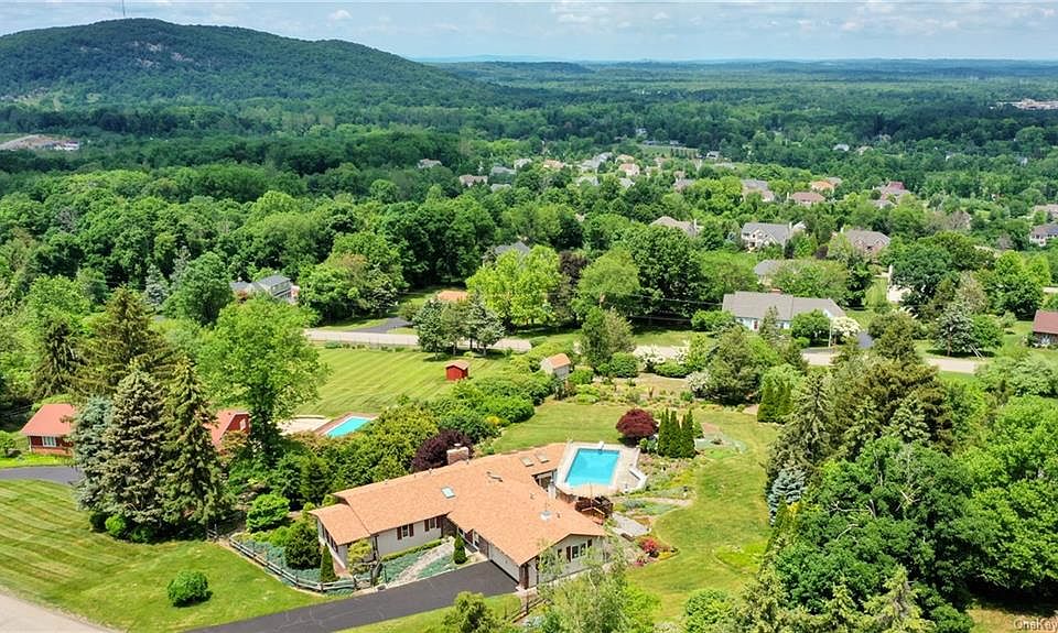 East Fishkill, one level, well built ranch home with an inground pool on 1.4 acres of awesome gardens and miles of views from most of the rooms, especially the 19 x 19 sunroom that overlooks the pool and pool house. Multiple level decks for outdoor gatherings. Slate custom stairs lead down to the pool area. Double front door entry to large foyer. 3 bedrooms and 3 full baths, livingroom with fireplace and formal dining room with hardwood floors in much of the home. Huge master bedroom with tray ceiling, walk in closets and more views. Vintage 70's eat-in kitchen w/ custom multi tiered pantry; and also door to sun room and back decks. Newer 6 year old roof. Most windows are Anderson. Guardian whole house generator. Laundry room on main level. Lower level has family room, summer kitchen, play room, full bath, storage, mechanicals and direct walk out to lower patio. Central vacuum. Oversized 2 car garage attached to main level. You may want to do some updates but it isn't necessary.