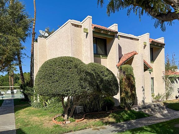 Located in a quiet, gated community just minutes from Palm Springs, this 2-bedroom, 2-bath condo offers a unique opportunity for those looking to personalize their space. The spacious downstairs includes a living room, dining room, kitchen, and a convenient half bath. Upstairs, you'll find two generously sized bedrooms, a full bath, and a private balcony with serene views overlooking the pool. A full-size washer and dryer are also conveniently located upstairs. This home comes equipped with a brand-new, energy-efficient 3-ton 17 SEER Lennox HVAC system to keep you comfortable year-round. With two reserved parking spaces, including one carport and one uncovered space, you'll always have a place to park. Plus, this property is on fee land, meaning no land lease, and comes with low HOA fees. Enjoy the community's peaceful ambiance with beautiful amenities, including a lake with waterfalls, two sparkling pools, relaxing spas, picnic areas, and tranquil sitting spots. The gated entrance ensures privacy and security. Perfectly located near the Palm Springs airport and just a short drive to downtown Palm Springs, you'll have easy access to shopping, dining, and entertainment. This cosmetic fixer is your chance to create a custom desert retreat while enjoying everything the desert has to offer!
