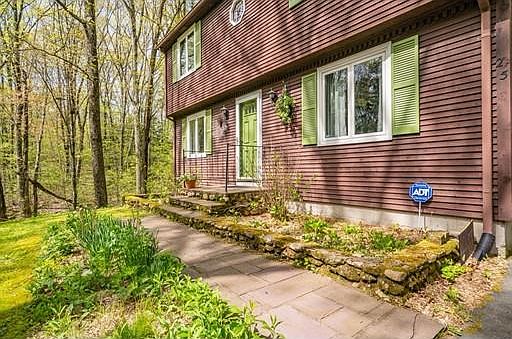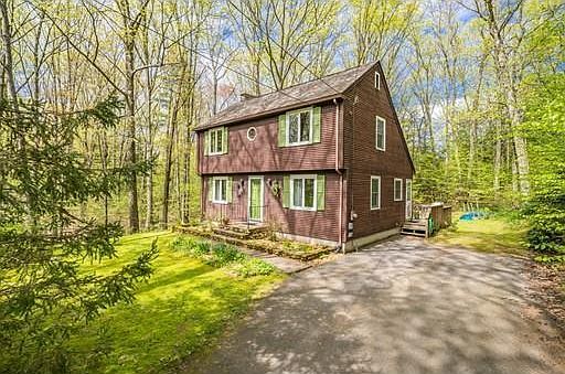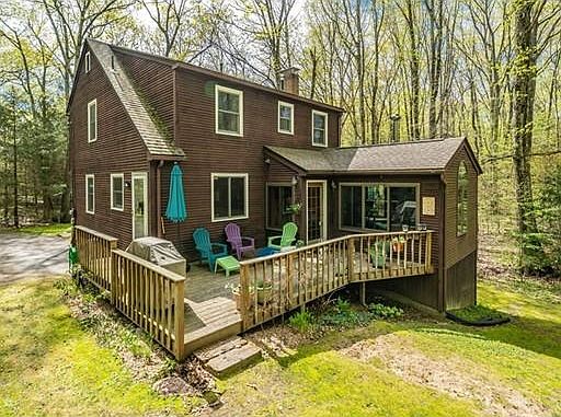 COUNTRY LIVING AT IT'S FINEST~ This wood sided saltbox is simply charming. Located on a wooded lot and set back, wildlife abounds. Both the sunroom and the deck out back are the perfect retreats. You will be sold on that alone! The home has been recently updated (including replacement windows and new furnace) yet maintains the charm of the saltbox with wood flooring, a country kitchen and separate dining room. The living room is large and has a wood burning fireplace- open to the sunroom. The 3 bedrooms are all on the 2nd floor and are all spacious and have a 2nd full bath to share. This home has been lovingly cared for and offers many improvements.