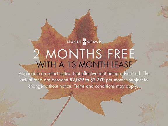 - Special offer! *Limited Time Offer: Get 2 Months Free with a 13 Month Lease on Select Suites! - Net effective rent being advertised. The actual rents are between $2,079 to $2,770/month. Promotional offer based on a 13-month lease with upto 2 months free. Subject to change without notice. Terms and conditions may apply. Schedule a tour to learn more.
