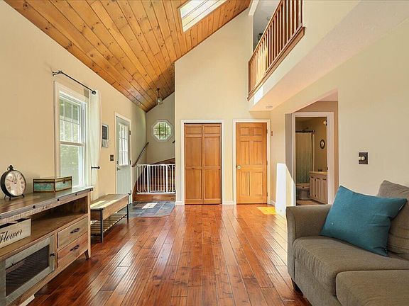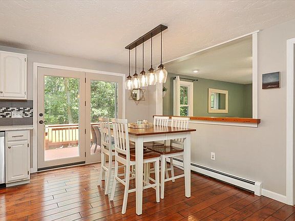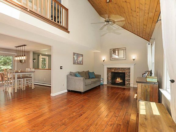 This charming Cape feels warm and welcoming from the moment you step through the front door. Open and bright floor plan features tongue and groove cathedral ceiling, hand-scraped maple floors and a wood-burning fireplace. Updated galley-style kitchen has marble countertops, stainless steel appliances and tile backsplash. Dining area opens to outdoor deck for dining al fresco on warm summer evenings. The family room off the kitchen offers a cozy place for friends and family to gather. First floor full bath with tiled floor. Upstairs there are two bedrooms and a shared full bath off a balconied hallway. There is a lovely finished room in the walk-out basement which can be used as additional living space, office or gym. New Fujitsu mini splits in living room and main bedroom provide a/c and additional heat. Set on a beautiful and private half acre lot which abuts acres of conservation land, the outdoor space includes a new patio with fire pit, stone retaining wall, new 10 x 10 shed and flowering perennials. Located in one of Sandwich's loveliest neighborhoods in an area known for its beautiful lakes, you'll have easy access to kayaking, swimming, hiking and biking trails.