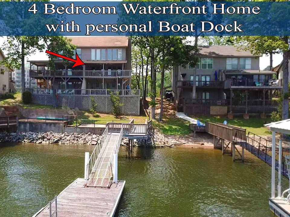 Stunning view of the lake from this waterfront duplex. 4 bedrooms 3.5 baths. Partially furnished. Bunk room is used as 4th bedroom. Bathrooms just remodeled w/ tile showers. 2 covered decks, one has just been redone. 1 large open air deck overlooks Grand Harbor Marina. Concrete patio right by the water, inclds private boat dock. One car garage plus storage. Enjoy on site activities such as, pool, tennis court. Ship store at marina,& fitness center. Gated neighborhood. Take the 3-D virtual tour.