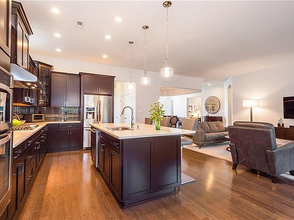 Better than NEW Merrick model for the smart buyer! This home CANNOT BE DUPLICATED at this price! Gorgeous Brick front & curb appeal. Brick paver walkway, landscaping & etched glass door greet you. Oak HW floors thru-out. Guest BR w/ Full Bath, bay window & bonus 1/2 bath off kitchen. Spectacular kitchen, oversized low center island w/ Quartz countertop, SS appliances, 5-burner cooktop, stunning backsplash, all barely used! Large Master BR w/ HW floors, tray ceiling, double walk-in closets & luxury bath w/ double sinks, stone floor in oversized clear glass shower, oval tub, quartz countertop & floor w/ radiant heat. Study w/ double doors. DIRECT STAIRCASE to ATTIC in garage! Lovely patio surrounded by professional landscaping. Full bath in guest room w/ gorgeous tile, clear glass shower Koehler fixtures & quartz countertop. The open floor plan on this home is perfect for entertaining. Dining Room open to Great Room open to Kitchen! What are you waiting for?
