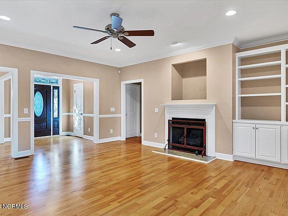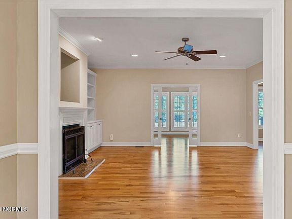 Living room has gleaming hardwood wood floors, natural gas fireplace and built-ins. Double french pocket doors open up to the Carolina Room/Den off livings room.