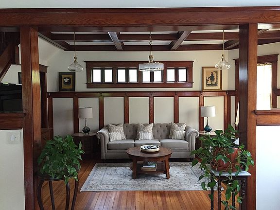 - RoomLivingRoomFeatures: Bay/Bow Window, Dec Molding, Built-Ins, Ceilings - Beamed