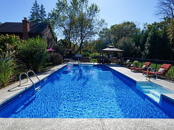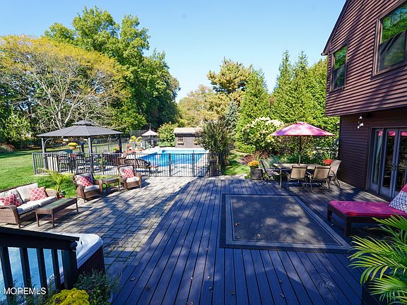 Welcome to 25 Nina Way - a spacious 5-bedroom, 3-bath home nestled on a beautifully landscaped ¾-acre lot. The private, park-like backyard features a fenced-in heated in-ground pool, hot tub, two-tier deck, patio, and two cedar sheds—perfect for entertaining or relaxing. Inside, the home offers hardwood floors throughout, a first-floor bedroom, and a warm family room with gas fireplace and custom woodwork. The updated kitchen includes stainless steel appliances, granite countertops, and a vaulted ceiling with skylights. Upstairs, find four generously sized bedrooms, two with walk-in closets, plus ample attic storage. Conveniently located just minutes from Red Bank, the Garden State Parkway, NYC ferry, and other transportation