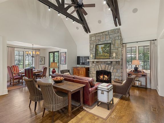 This turn-key home, ready for immediate enjoyment, is located in the prestigious, gated community of Satulah Village, a rare blend of cozy charm and luxury living, and just a short stroll to downtown Highlands. Walk to town for fine dining, boutique shopping, and vibrant cultural experiences, then retreat to your private sanctuary just minutes away. This home perfectly balances privacy and convenience, with sweeping views of the neighborhood's beautifully maintained park-like gathering spot. Thoughtfully designed for refined mountain living, this one-and-a-half-level home offers inviting spaces both inside and out. Stone accents and lush landscaping frame a series of outdoor living areas, including a peaceful terrace with a pond and a fenced, low-maintenance backyard. Enjoy step-free access from the single carport or the inviting front door. Inside, the main level welcomes you with a grand living room anchored by a soaring native stone fireplace, creating a warm, sophisticated gathering space. The kitchen showcases custom quartzite countertops, a built-in refrigerator, Bosch appliances, gas range, and sleek cabinetry. A wet bar with wine storage serves the living room and dining areas. A second stone fireplace in the cozy den offers a relaxed atmosphere for coffee in the morning, cocktails in the evening. The main-level primary suite serves as a private retreat, complete with a spa-style bath featuring a walk-in shower and refined finishes. A powder room for guests completes the main floor. Upstairs, three generous guest suites, each with its own en-suite bath, ensure elevated comfort for family and guests alike. This move-in-ready home also offers the rare opportunity to transfer a no-deposit membership to Old Edwards Club, which includes exclusive access to GlenCove's exceptional amenities. Old Edwards Club offers a championship golf course designed by Tom Jackson, tennis courts, fitness facilities, fine dining, and a pool with mountain views. GlenCove complements this lifestyle with a 12-hole par-three course, wellness amenities, a trout pond, adventure barn, community garden, biking and hiking trails, and a vibrant, family-friendly atmosphere. This isn't simply a place to live - it's a chance to immerse yourself in Highland's lifestyle at its most refined. Timeless elegance, natural beauty, and a rich cultural backdrop converge in this exceptional offering within one of Highlands' most prestigious communities.