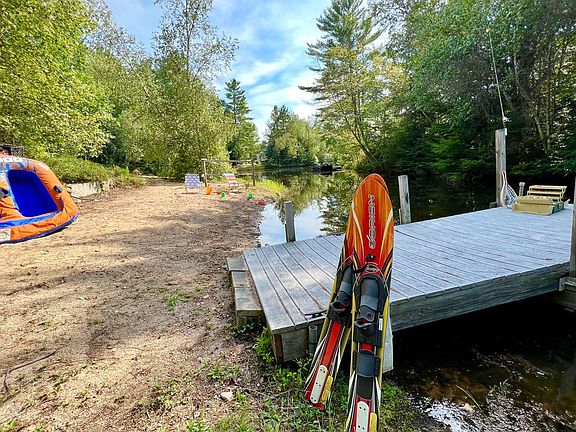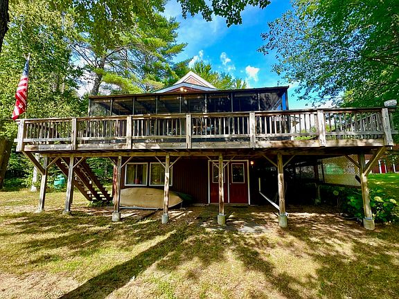 Private, year-round, waterfront home on Lake Belleau. The 1.5 acre property is made up of: the knotty pine home with outside shower, a shed by the lake, a dock with private beach, and a 2-story, 3 car garage with well water via a field hydrant. This hidden gem sits on a dead-end road as well as a cove/canal leading to the lake. Belleau Lake is a 187 acre lake in a 5.82 square mile watershed in Wakefield, NH. The bright and airy home has open beam ceilings, beautiful wide board floors, a seasonal screened-in porch, a farmer's porch and a wrap-around deck. Two bedrooms are on the 1st floor and the bedroom in the loft is big enough for 2 twin beds with an oversized closet and built-in drawers. Home has a Rinnai tankless water heater; included is a never-used water tank meant for the 2nd story of the 24 x 36 garage, making it a great option for possible in-law expansion or workshop. Golf is 3 miles away and conservation walking trails are nearby. Drive your snowmobiles right to the 7 Lakes snow-mobile trails. Relax by the firepit with friends and family...after spending the day on the lake. OR, relax around the wood stove...after a day of snowmobiling. There is an underground lawn irrigation system that uses lake water. Large area for gardening. Come find out why this is considered such a special place!