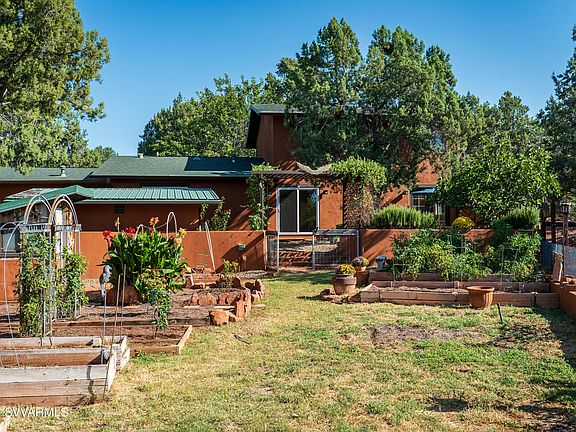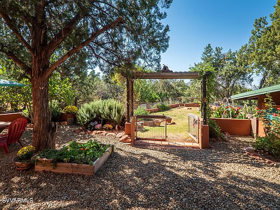 25 Piki is a festival of great interior space combined with an outdoor food forest that will feed and entertain many. Enter to a roomy, bright atmosphere featuring attractive travertine tile floors and plenty of room to enjoy. To one side is the living area, and to the other is a welcoming dining area leading to a generous kitchen with bar-height island, elite gas store, large side-by-side refrigerator/freezer, copper farm sink, plenty of birch hardwood cabinets and granite counters. The nearby laundry room with a stacked washer/dryer features a sink, access to the outside, and a door leading to the finished garage with air and heat. Also on the ground floor are two brightly-lit bedrooms with hickory hardwood flooring, ample closets and sliding-door access to the backyard. The guest bedrooms share a full bath. The expansive living room features a gas fireplace and plenty of space to get creative with furnishings. A staircase off the living room leads to the large primary bedroom and bathroom ensuite, which is one of the crown jewels of this fabulous house. The bedroom features doors leading to a private deck with stunning views of Thunder Mountain. Inside is the large walk-in closet, a built-in safe, a second washer and dryer, a large walk-in shower, heated bathroom floors, and a jacuzzi tub near large windows that provide views of your beautifully landscaped backyard. Walk back downstairs and outside to enjoy the backyard landscaping and animal-proofed garden area with multiple raised fruit and vegetable beds. Just beyond one of three garden buildings on the property is a stand of twenty fruit trees offering a variety of delicious flavors. Outside, you'll also find the entrance to the garage with room on either side of an adjoining gate for additional vehicles, or a possible garage expansion. A fabulous addition to the property is a casita, perfect for guests who come to stay and would appreciate some alone time, as it is placed to ensure privacy. The casita has a full bath, a kitchen with an electric stove and refrigerator, and a wood-burning stove. Just outside is a path that gives casita guests their own access to enjoy the garden areas.