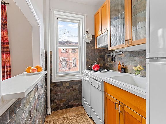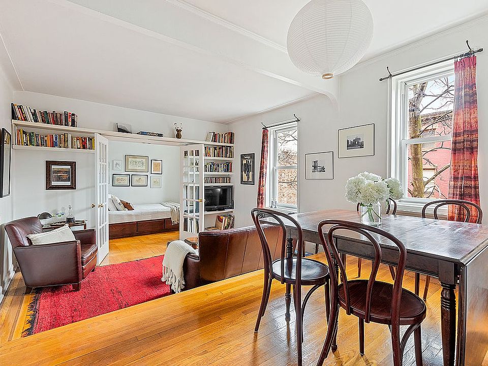 This charmer boasts high arched ceilings, hardwood floors and five west-facing windows offering views of treetops and blue sky above the neighboring bucolic buildings.