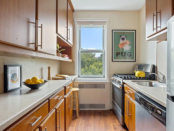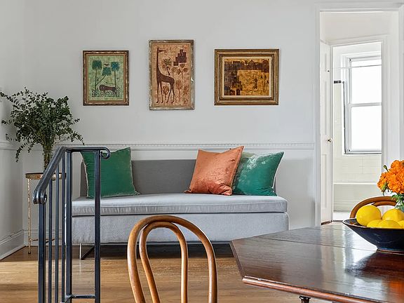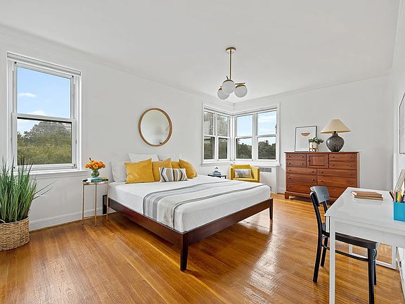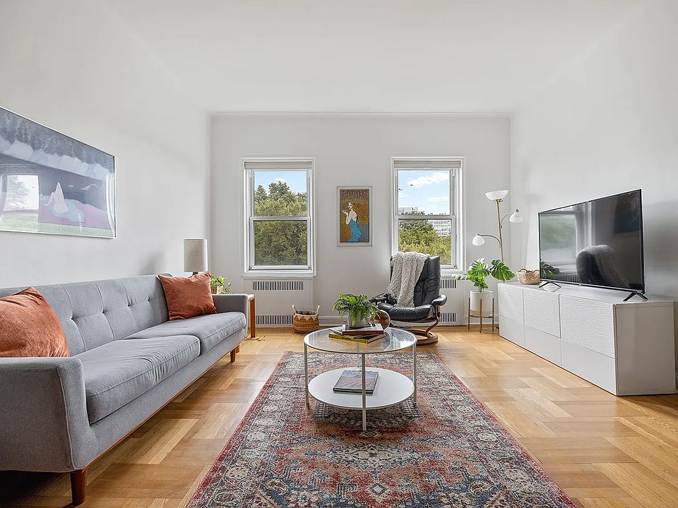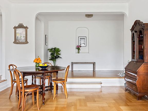 All showings by appointment only. Overlooking Grand Army Plaza and featuring elegant prewar proportions, this serene top-floor 2 bed 2 bath corner apartment has treetop views from three exposures and is bathed in sunlight all day. Enter through from a wide foyer with twin storage closets and step down into a generous sunken living/dining room with open, leafy views. The bright windowed kitchen opens to an alcove that accommodates either a dining table or seating area. With double corner windows and ample space for a desk, the main bedroom has two large closets and an en-suite, windowed bathroom. Also oversized, the second bedroom has a large closet and direct access to the second bathroom. Both bathrooms have tubs and original tile in good condition. Original hardwood parquet floors are in beautiful condition and are complemented by arched doorways and classic moldings, set off by new windows throughout. Only one direct flight up, two shared roof decks have breathtaking city and park views. Protected by a leafy berm of trees, 25 Plaza Street West is one of Park Slope's most sought-after full-service elevator buildings. Amenities in this exceptionally well-maintained building include a doorman (8am-midnight, 7 days a week), a live-in super, laundry room, bike storage, (short wait listed) basement storage and even an indoor parking garage (longer wait list). Pied-a-terre, co-purchase and guarantors are all permitted. Pets are welcome. Conveniently near Grand Army Plaza and Prospect Park, the Brooklyn Library, Brooklyn Museum, the Botanical Gardens, all the amenities of 7th Avenue, the vibrant restaurants and shops of nearby Vanderbilt Avenue, and of course, the 2/3, B/Q and D/N/R/W trains.