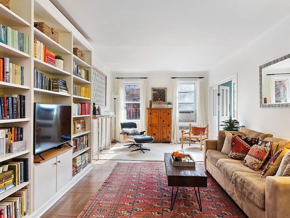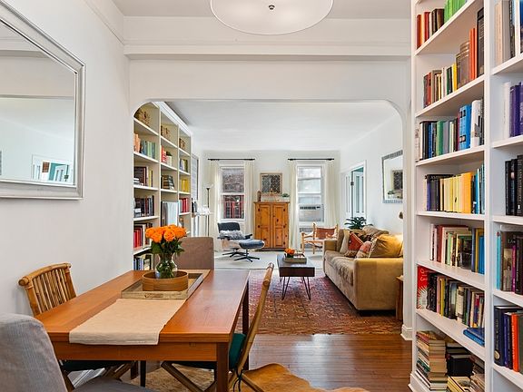 Welcome home to the Berkeley ~ an elegant doorman building near the entrance of Prospect Park! After entering the glamorous lobby at 25 Plaza Street West, there are several stairs to the entrance of this elevated first floor apartment. Apartment 1L provides picturesque views of Brownstone Brooklyn, trees, light and sky from every window. This 2 bedroom Park Slope home offers a very versatile layout with lots of room to eat and gather! A super spacious living room, easily divides into two separate living areas, allowing you to create a space that works just right for you. A separate dining area is off of the kitchen, and a graceful entryway adds to this very functional home. A proper entry foyer offers 3 closets! to store coats and shoes, including a fully-shelved closet for storing all of your essential household supplies. Pre-War details grace this apartment throughout, including beautiful arched doorways, almost 10 foot ceilings, niche shelving and hardwood floors. Beautiful built-in bookcases in dining area and living area, create a great use of storage, space and design. This very quiet apartment has 2 split, corner bedrooms. The master bedroom is oversized, and provides a spacious, sunny retreat. Easily accommodating a king-sized bed, this corner sanctuary offers pretty views and a great place to set up a desk or reading nook as well. 2 closets and plenty of wall space allow you to store all with ease. A second corner bedroom is set off of the living room, overlooking brownstones on charming Berkeley Place. This queen-sized bedroom is on the opposite end of the master bedroom with tons of light and solitude. Opt to keep the doors open to the living room during the day, for extra light and sunshine. A windowed kitchen provides all you need including pretty wood cabinets with lots of storage, slate flooring and countertop, built-in microwave and dishwasher. A bright, windowed bathroom is just outside of the master bedroom. The building has two common roof decks with amazing views of Prospect Park, Brooklyn and Manhattan Skylines, and the New York Harbor. Common laundry is easy to access via elevator to basement. There is a live-in super, and a part-time doorman 7 days / week - 8:00 am to midnight. Parking spaces and storage are currently waitlisted. The coop is pet-friendly, and allows pied-a-terres, guarantors and co-purchasers. 25 Plaza Street West is tucked away on quiet Plaza Street, with easy access to 2/3/4 trains a block away, and B/Q trains about 3 blocks away. At the intersection of Park Slope and Prospect Heights, this terrific location is near great shopping and restaurants, along with many of Brooklyn's sought-after destinations ~ Grand Army Plaza Greenmarket, Park Slope Food Coop, Brooklyn Library, Brooklyn Museum, Brooklyn Botanic Gardens and Barclay's Center. ** First Open House is Sunday, March 7th!!