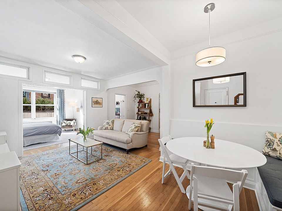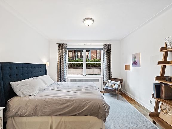Welcome home to The Berkeley, a gorgeous pre-war coop that perfectly marries elegance with practical living. Entering residence 1M, the open concept living room & dining room welcomes homeowners and visitors alike. The spacious entryway has been outfitted with a custom array of coat hooks. Further in, the dining area boasts *hand-built banquet seating* with storage beneath. The living room is situated in the middle of the apartment and functions as a gathering space as well as a place to relax and unwind. Windowed pocket doors separate the bedroom from the living room and transom windows above ensure that light and air can move freely through the apartment. Leave them all open to create a massive airy space or slide them all closed for privacy. The bedroom can easily *accommodate a king-sized bed* (queen-size shown here) and wide, west-facing windows bring in plenty of afternoon sunshine. The second room is perfect for use as a nursery, office, reading area or meditation room. There are built-in shelves carved into one wall and separate entrances allow for airflow. The 10’ kitchen features green glass tile backsplash, quartz countertops and cherry hardwood floors. There is ample counter and cabinet space as well as a pantry with customizable Elfa shelving. Full-sized appliances include a *dishwasher* and *microwave.* Opposite the kitchen, the middle area is currently used as an office but can easily accommodate a play area or second dining area. At the back of the apartment is an 8’ X 5’ dressing room outfitted with a customizable Elfa closet system. Next to it, there are three floor-to-ceiling closets: the first is double wide, the second is double deep and the third is lined with shelves perfect for picnic blankets, linens, tools and supplies. The current owners store a five-piece drum kit as well as a full wardrobe in one of the closets… with ease. The bright windowed bathroom features white tiling, pebble stone flooring a pedestal sink along with a recently reglazed bathtub. *Washer-dryer installation is allowed* in the apartment and there are period details such as arched doorways and hardwood flooring throughout. Located a half-flight of stairs up from the first floor, apartment 1M looks out at the back of the parlor-level townhouses down the hill along 8th avenue. The Berkeley is a doorman elevator building with *two roof decks:* one facing the arch at Grand Army Plaza and the other boasting stunning views of Brooklyn, Manhattan, New York Harbor, New Jersey, and Staten Island. Sunsets and East River fireworks never grow old. The building is *pet-friendly* and allows for co-purchasing, guarantors and pied-a-terres. The lobby and hallways were recently renovated and the basement features a *shared laundry room* as well as *bike storage* accessible via the elevators. Additionally, there is a *storage room* and *parking garage* within the building - note there is a waitlist for both. There is a *live-in super* as well as part-time *doorman: 8am to midnight, seven days a week.* The building is wired for *FiOS and Spectrum.* The 2/3 train is at the end of the block, the B/Q trains are a little farther on Flatbush. Atlantic Barclays is right down the hill (go Nets!) and houses myriad subways as well as the LIRR to get out of town. There is a wealth of nearby restaurants and cafes on 7th Ave and on Flatbush. There is an even wider selection of food and shopping on Vanderbilt, Underhill and Washington in neighboring Prospect Heights. Union Market is around the corner along with Soul Cycle, an enormous Crunch gym and multiple pharmacies. Grand Army Plaza plays host to a spectacular Farmer’s Market on Saturday mornings. Just beyond, the Brooklyn Library, Botanic Gardens and Museum line Eastern Parkway. The Park Slope Food Coop is two blocks down on Union and saving the best for last, Prospect Park serves as a respite from the hustle of city life.