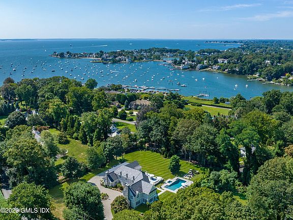 Located in the sought-after waterfront enclave of Wilson Point, this meticulously renovated 5 bedroom 4.2 bath, Nantucket-style shingled residence spans over 6500 square feet of finished space and over an acre of beautifully landscaped grounds. Entering through its grand entrance with double height foyer, accented by elegant twin staircases, guests are enveloped by natural light. The kitchen boasting a prominent island and top-of-the-line appliances including La Cornue & Sub-Zero, offers an easy flow to the family room with vaulted ceilings and fireplace. Upstairs, the home showcases five generously-sized bedrooms. The Primary Suite is spacious and refined, featuring a cozy fireplace and a vast bathroom crowned with vaulted ceilings, a deep soaking tub, and twin vanities.
