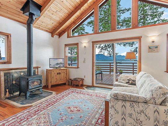 - Description: Vaulted ceilings, water view, wood stove, deck