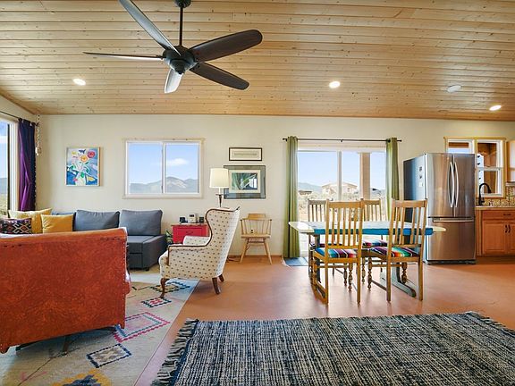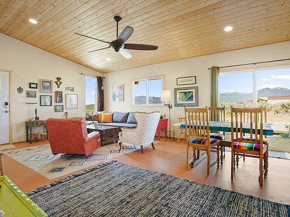 WIDE OPEN SPACES - Welcome to this charming pueblo-style home on Tortuga Mesa in Taos, offering breathtaking panoramic views in all directions. Located in an emerging residential area with buried utilities, this 2-bedroom, 2-bathroom home spans 1100 sq.ft on a serene 1.3-acre lot. Upon entry, the home captivates with its vaulted ceilings and durable concrete floors, complemented by abundant windows that invite spectacular views and natural light inside. The front entry portal and covered carport provide a warm welcome and sheltered parking. Open concept living/dining area with functional kitchen with stainless appliances. The primary bedroom has vaulted ceilings, door to the outdoor space and large ensuite bathroom with walk-in shower. Designed for comfort and efficiency, the home boasts a 3-zone radiant in-floor heating system, ensuring year-round comfort, while an on-demand hot water system and whole house water filter enhance convenience and quality of living. The owners have meticulously curated modern finishes and conveniences throughout, including custom tile work, designer lighting, and ceiling fans in each room. Unique Talavera sinks, antique bathroom mirrors, and exterior light fixtures add character and charm. Fully furnished if desired, this turnkey residence includes dimmable recessed lighting and built-in TV setup thoughtfully integrated to blend with the home s aesthetic. The north-facing orientation captures inspiring views of Taos Mountain, while west-facing windows frame stunning sunset vistas. Set amidst a beautiful gently rolling lot surrounded by native sagebrush, the property features a storage shed for gear and extras, a circular driveway for easy access, and a comfortable front porch area perfect for relaxing and enjoying the quiet surroundings. Additional amenities include a mini-irrigation system for flowerpots, ample storage with large closets, and an open floor plan that maximizes space and flow. A vintage stained glass transom window above the primary bedroom door adds a touch of historic elegance. This custom-built home has been a successful Guest Favorite Airbnb rental, boasting a 5-star average review. Ideal for those seeking a tranquil retreat or primary residence with modern conveniences, this meticulously maintained home offers a perfect blend of style, comfort, and Taos charm.