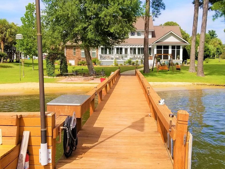 Waterfront showplace in gated community on Lake Marion. Custom brick hm w/upgrades throughout. Tremendous 30' Vaulted ceiling in Great rm, 2 bdrm suites on 1st floor, loft area, 3rd guest suite up plus FROG can be used as 4th bdrm, hobby rm, man cave - you choose! Main living area w/18' ceramic tile, open floorplan w/breakfast bar opening to kitchen. The kitchen has huge center island w/prep sink, lots of cabinets w/silkstone counter-tops & roll-out shelves lots of windows & access to the huge sunroom. Views of water from most rooms!! Large stor closets, dbl side service door into garage w/concrete sidewalk. Drive golf cart to pierhead. Pier is lighted w/benches & Sunsetter remote awning. 6,000 lb covered Boat lift. Sandy swimming beach. Insta-hot water, Home generator. Home Warranty!