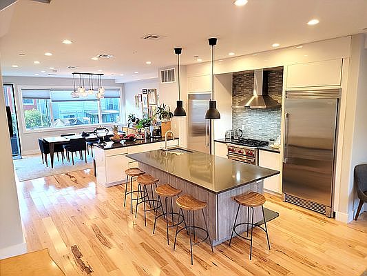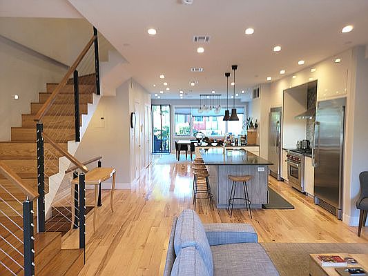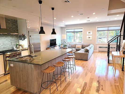 Boasting this more than 2,000 sq. ft., expansive, pristine and stunning, sundrenched, 4 bedroom, 2-1/2 bath duplex with gorgeous wide plank hickory wood floors, an open concept living room, dining room and a magnificent custom kitchen with an eat-in island, 36" Wolf Stove and all high-end stainless steel appliances and cabinets galore. The primary ensuite leaves nothing to be desired, with two spacious walk-in closets and a top of the line bathroom with a deep soaking tub and separate shower with all high-end finishings. The three other bedrooms are all large and sunny and beautiful. This seamless layout is accentuated by the 9 ft. ceilings, oversized custom windows, and perfectly situated built-ins and details throughout. Step out to the rear deck, just off the formal dining room, perfect for barbecuing and entertaining. Then step down to the sprawling rear grounds, rich in botanical greenery, reaching far and wide. Central air conditioning, laundry, tons of closets, and an additional locked storage room in the finished basement. Situated on the top two floors of this meticulously maintained, all new, two family, three story townhouse on one of the most premier, highly sought after, quiet, tree-lined blocks in prime Windsor Terrace. A half block to Prospect Park and a plethora of restaurants, bistros, and outdoor cafes. Just three blocks to the KeyFood Windsor Farms Market and Walgreens. Steps to the Fort Hamilton Pkwy stop on the F/G trains and just 25 minutes to NYC or the famous Coney Island Beach and Boardwalk. Your friendly, well-groomed, well-behaved pets are welcome too! Available January 1st
