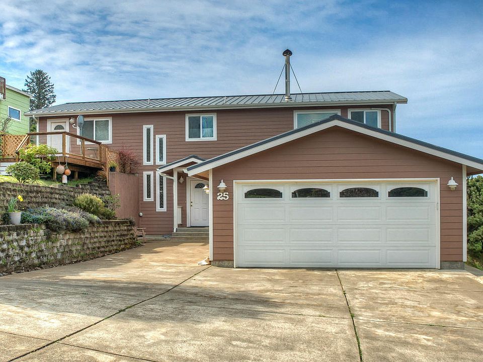 This lovely 4 bedroom 3 bath 2565 sq ft Yachats home has beautiful ocean & bay views from most every room. Upper and lower levels that has separate living areas allows for extra family or guests to have their own privacy, and space with laundry & refrigerator on both levels. Hardwood oak floors,tile,extra deep closets & lots of storage.Ductless heat pump,radiant heat,baseboards and a wood stove. Lovely patio on upper level with fenced area for pets. Just a short distance to downtown or the beach.