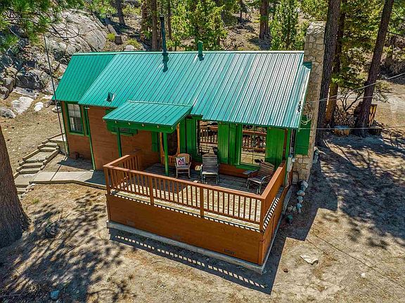 The character of this cabin will captivate you, but its privacy will endear you to the grandeur and peacefulness of the mountains. In the heart of the “Alps of the Sierra,” you will find this amazing, traditional USFS Cabin in the Woods. Remodeled while retaining its original charm, it features wood floors and walls, a wood-burning fireplace, a Monarch electric/wood cooking stove, and retro white metal cabinets. Plus, there’s a handcrafted Navarro canoe tucked under the deck, ready for a day out on the lake, launched from your shared boat dock, a short distance from the cabin. The main house is single-story with two bedrooms, tiled bathroom, and forced air heat. It also includes a gathering room with a dining area, a stone fireplace, and an outdoor porch that overlooks June Lake. The newer guest house, which has one bedroom and one bath, is modern in efficiency with beautiful wood windows, forced air heating, a washer/dryer, and a slate bathroom with a glassed shower. It captures the magic of sleeping in the woods, including an elevated nook that looks out onto the granite monolith that surrounds the property. A bonus workbench and storage area are attached. The property is sold furnished.