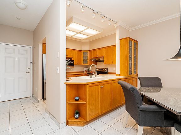 Prime walkable location! This move-in ready, top-floor, end unit in the sought-after FRASERVIEW adult-oriented community is steps to parks, dining, shopping, hospital, bus, SkyTrain and the new aquatic and community centre. Meticulously maintained by the original owner, it features 9’ and vaulted ceilings, a bright open layout, engineered hardwood and tile flooring, crown mouldings, stainless appliances, and a cozy gas fireplace—BONUS gas and hot water included in the strata fee! The spacious bedroom fits a king bed and opens to a private covered balcony overlooking the quiet courtyard. Includes in-suite laundry, 1 parking, and a large storage locker.