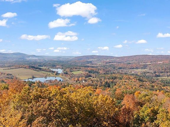 Contemporary compound perched amongst the oaks with spectacular sunset views over the hills and dale of Hillsdale. The 3 bedroom, 2-1/2 bath 2,218 square foot main home has a tree-top wrap-around deck with access from both the great room and a main floor primary en-suite which includes a laundry area, walk-in closet, and a bath configured with double sinks, separate shower and tub. The 25' x 22' living/dining area features a massive wood burning fireplace, vaulted 14 foot ceilings and picture windows offering a sweeping view overlooking the valley, pond and the hills beyond. The multi-level home also offers two lower level bedrooms with a full bath, and a few steps up from the main living area you will find a family room or office. Also on this level is the eat-in galley kitchen which is adjacent to a sky-lit yoga studio. The prior owner (a noted craftsman) had a well-ventilated workshop a few steps down from the main level and accessible from the attached two-stall garage, which could be whatever you need it to be: additional storage, a new in-house gym?From the home's thoughtfully planted entrance courtyard, follow the bluestone path to the detached garage, showroom and workshop, which can be reconfigured to your needs. With two very large half baths and two levels of open space, this somewhat blank slate can be reconfigured for whatever you desire -- a tremendous gathering place, a display space for large collections, a studio? In addition, this 4+ acre property is part of the Overlook Development association which maintains walking trails and a swim pond, within a short walking distance. Bring your vision to this wonderful property, which offers so much and has even more potential.
