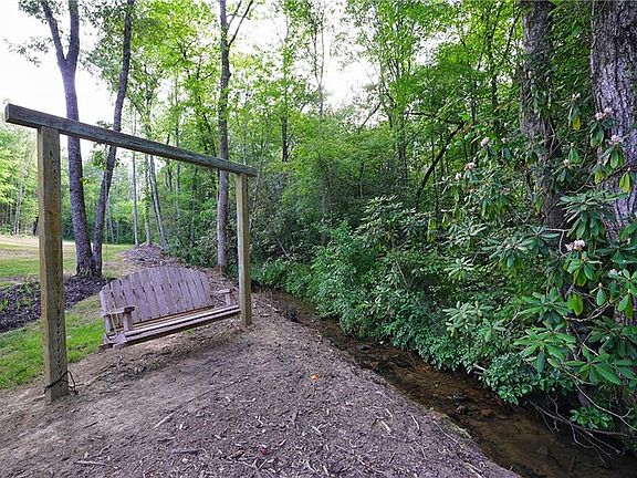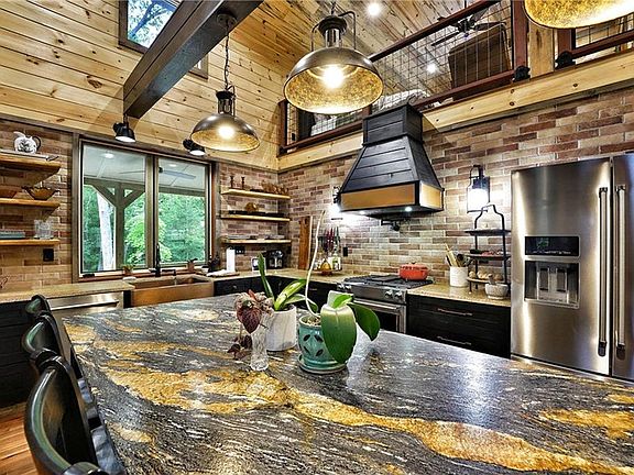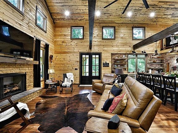 Stunning custom barndominium on a creek lot with lots of privacy – no HOA and no restrictions. Finished in late 2024, this home sits on 1.7 acres of level to very gentle terrain featuring beautiful Rose Creek and a setting tucked away from view of any neighbors. Located on a private rural road, the fun starts as you gently cross a small shallow creek that is easy to drive through. You then arrive at the half-circle driveway, where the timber porch and wood accents create a warm and inviting first impression. Interior highlights include stylish designer accents throughout the home. This bright and fresh 2-story open-concept great room boasts a beamed cathedral ceiling lined with Blue & Buggy Pine wood that creates a warm backdrop for the striking 10-foot contemporary ceiling fan. The cozy factor really kicks in with rich hickory wood floors, knotty pine wall accents, and a masonry-inspired stone veneer fireplace. The kitchen is a master class with a custom 4' x 8.5' island topped with Magna Gold leathered granite, Sunset Gold granite perimeter counters, a copper farmhouse sink, custom cabinetry, designer lighting, a unique vent hood, and open shelving. The main-level primary suite offers its own in-wall fireplace, a double vanity with copper sinks and leathered granite, a walk-in shower with ceramic tile, and a vaulted custom closet with built-ins and pass-through to the laundry. Upstairs, a loft bedroom includes a full bath and travel closet. A spacious laundry room with custom cabinetry, counters, and natural light doubles as a butler’s pantry, coffee bar, or craft space. Outdoor living is a highlight with 1,080 sq ft of covered wraparound porch plus a separate attached open porch designed as an entertainment space with a hot tub. A little further back from the uncovered deck, Rose Creek flows through the property with a swing perfectly placed to enjoy the sounds of rushing water. Built for durability and style, the exterior showcases standing seam metal roof and siding, with natural wood accents. The home sits on a 5-foot crawlspace, providing easy accessibility and convenience for maintenance. Unrestricted, so short-term rentals are okay! Other highlights: dual-chamber septic system, tankless water heater, pre-wired for generator, and fiber optic internet. Conveniently located near main roadways — about 15 minutes to McCaysville, 20 minutes to Blue Ridge, and 30 minutes to Ellijay.