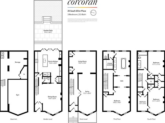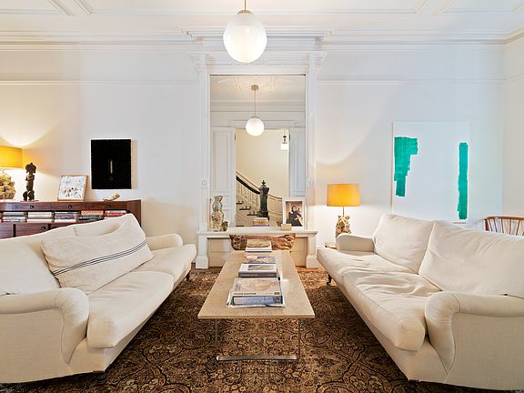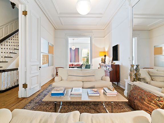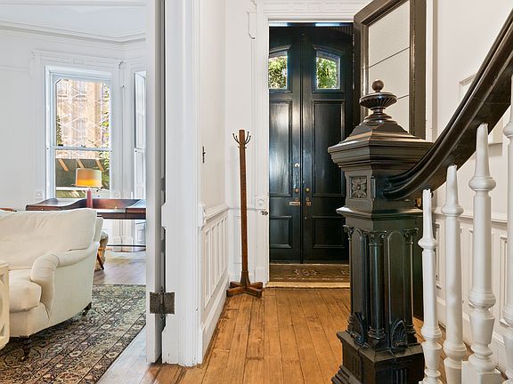 Welcome to 25 South Elliot Place, a classic four bedroom and two-and-a-half-bathroom single family brownstone located in the heart of Fort Greene. Built in 1899, this home stands a true testament to turn-of-the-century design, which seamlessly ties historic architecture with contemporary accents. This is an exceptional rental opportunity for those who value timeless beauty and modern comforts. Entering through the original mosaic-tiled vestibule, you are met with soaring ceilings adorned with intricate crown molding, original wainscoting and wood work. The double hung windows invite natural light to pour into the dual living spaces. Pocket doors, original to the home, provide an elegant touch of privacy, while the working wood-burning fireplace becomes a warm focal point during cooler months. Every detail of this floor reflects craftsmanship of a bygone era, elevated by the original waxed oak floors that flow throughout the home. Descending to the garden level, you enter into the formal dining room, which leads to the expansive kitchen, outfitted with Calcutta gold marble countertops and custom cabinetry. Additionally, the kitchen features a Sub-Zero refrigerator, a Bertazzoni six-burner gas range, and a built-in bar complete with a sink and ice maker. Two wood-burning fireplaces imbue the space with a cozy charm, while a built-in sound system and a powder room add to the level's functionality. Beyond the kitchen lies the expansive mature garden, an oasis framed by Belgian waddle fencing. The garden is anchored by a magnificent cherry blossom tree that bursts into bloom each spring, which provides the perfect backdrop for alfresco dining and entertaining. The entirety of the third floor is devoted to the primary suite. The bedroom features a gas fireplace, creating an intimate atmosphere. A spacious walk-in closet offers abundant storage, while the en-suite bathroom rivals a luxury spa. Clad in Kenyan black marble, it features a steam shower, a standalone marble soaking tub that is positioned beside its own gas fireplace. The top floor provides endless versatility. There are two generously proportioned bedrooms, each with its own walk-in closet. Non-working fireplaces add charm to the rooms. Additionally, a third room, currently used as a study, can easily be utilized as a fourth bedroom. The bathroom on this level, features Blue Savoy marble, complete with a soaking tub. Below grade, there is a gym/yoga studio, that is equipped with free weights, a rowing machine and floor to ceiling mirrors. Additionally, the laundry, along with a large storage area-maximizes the additional space. Modern amenities, including central air conditioning, an ADT alarm system, and high-speed internet, ensure the home is as functional as it is beautiful. Situated half a block from Fort Greene Park, this brownstone is ideally positioned near the farmer's market, Whole Foods, and an array of boutiques, wine shops, and restaurants that define the neighborhood's vibrant charm.