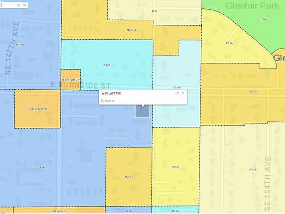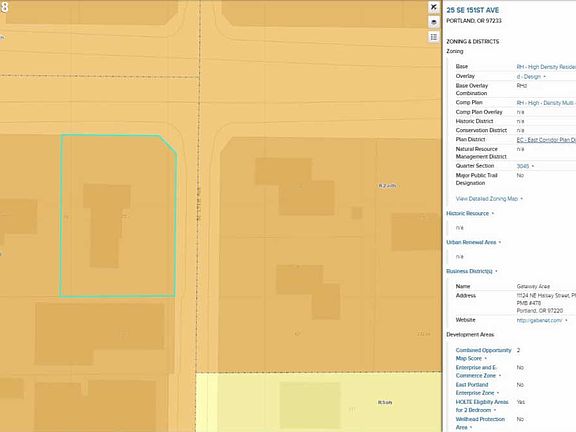 ZONED RHd in the East Corridor Plan District (no minimum required parking spaces). HIGH DENSITY RESIDENTIAL. Buyer to do their own Due Diligence but initial discussions by Owner with City identified the FAR of up to 60,000sf. Attached at a minimum of 15 units. Corner lot at 151st and Burnside. Development access off SE 151st. One block east of MAX Station.