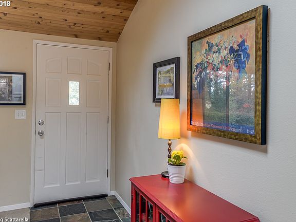 Darling ranch home in great location! One level living nestled in private setting.Skylights!Amazing fir ceilings in LR,DR,Kit.LR w/gas fp,river rock surround.Kit w/slate flr, concrete ctrs + blt in cutting boards,copper sink,gas cooking,eating bar,island.3 bedrooms,all w/hardwood flrs. Full ba w/tile work + wainscoting.Pocket doors.Serene yard w/deck,blt in seating, firepit,gardens.2 car garage. NEW furnace + Ht Pump