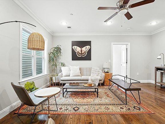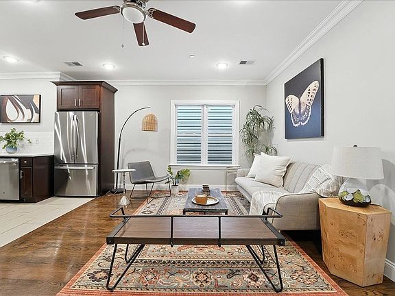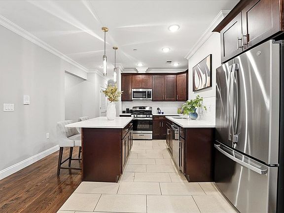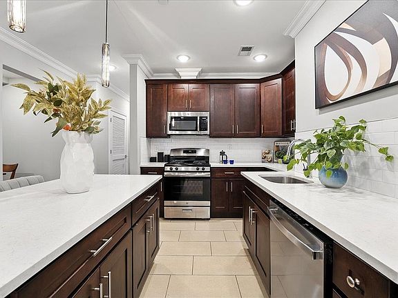 Entering into the open plan kitchen and living area, beautiful details like crown molding, gleaming stained hardwood floors, ceiling fans and pendant lighting shine throughout. Bright white eat-in kitchen showcases custom shaker cabinets, quartz counters, subway tile backsplash and stainless appliances. Bathrooms are tiled to ceiling with convenient soaker tubs and shower plus vanity and oversized medicine cabinet mirror. Master en-suite impresses with two large windows, two closets plus additional walk-in closet with window for natural light for ultimate storage.