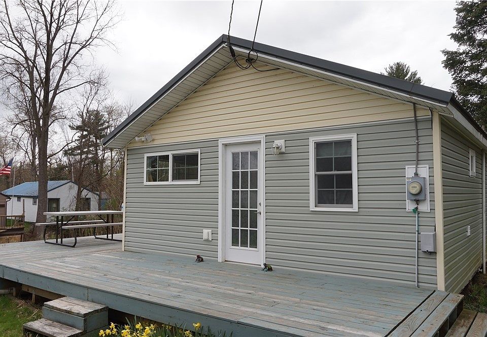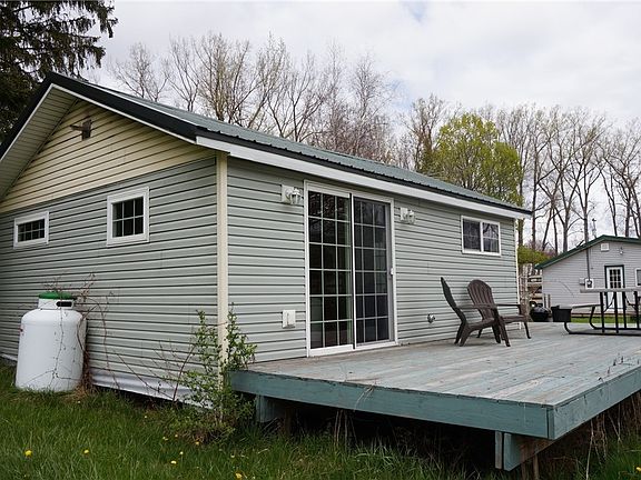Back on the market due to buyers loss of financing only! This adorable waterfront cottage offers access to North Sandy Pond & Lake Ontario while offering great protection for your boat. Dock in place that is adjustable for changing water heights. Home was completely rehabbed in 2013. White washed shiplap walls and blue tongue & groove vaulted ceilings make for a light & bright beachy feel. 2 bedrooms and 1 full bath, that has washer dryer combo. One bedroom has built in bunk beds that are removable. Living room - kitchen combo with peninsula style seating and Caribbean like feel with custom cabinets & tiling. Sliding door to large wrap around deck, makes for the perfect place to entertain on those summer days. Shed for storage. Home is public water connected.